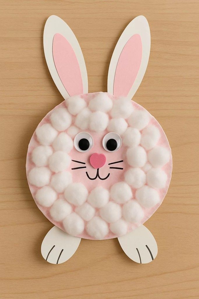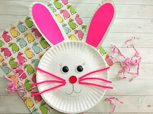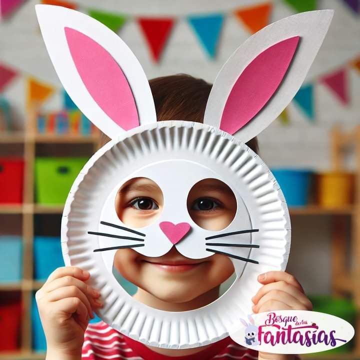 - Paso a paso: Usa el plato como la cara del conejo. Recorta dos orejas largas en cartulina blanca y dos más pequeñas en rosa para el interior. Pégalas en la parte superior del plato. Añade los ojos móviles, dibuja una nariz rosa y unos bigotes largos con el marcador.